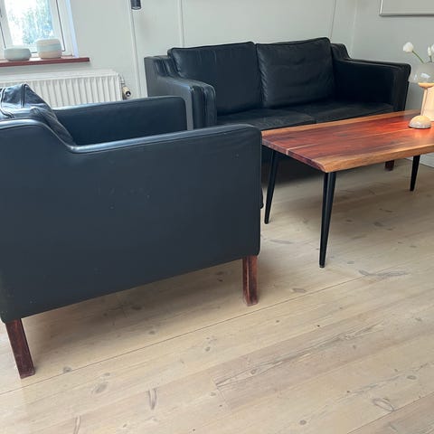 Sofaen har en enkel og elegant design med en kombination af læderpolstring og træramme. Den har bløde hynder for komfort og en naturlig træstruktur.,Bemærk at mail, chat og beskeder ikke besvares, og varen skal købes på knappen "Gå til varen"