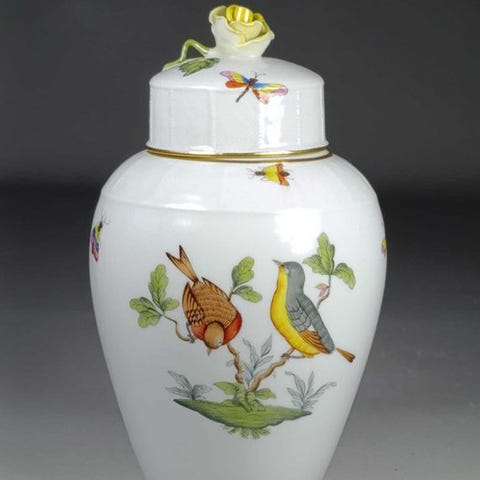 Den er understøttet af en firkantet base og har udsmykkede forgyldte håndtag samt omfattende forgyldning på kroppen og låget.