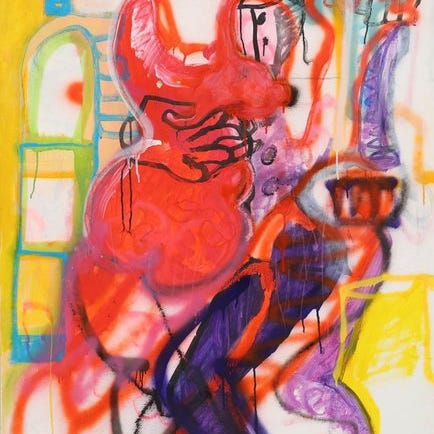Smukt stykke af Eleonora Stol. Farverne er så livlige og springer ud af værket. Det er blandet teknik på lærred. Eleonora bruger forskellige materialer som akryl, blyant og olieverf.