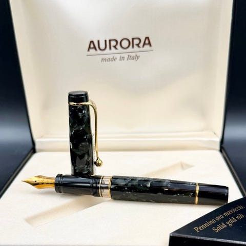 Aurora 888P, stilografisk pen og Aurora kuglepen, komplet penne sæt med original æske mod original æske og dokumenter, der bekræfter, at materialerne er autentiske Aurora. Hætter, klips og beklædning i denne serie er forgyldt med 18 kt. guldlegering på specielt metal.