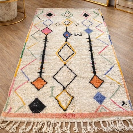 Bring varme, stil og autenticitet ind i dit interiør med dette smukke håndlavede Berber-tæppe. Dette unikke stykke er fremstillet af håndværksmæssige vævere fra Atlasbjergene, kendt for deres århundredgamle traditioner og raffinerede håndværk.