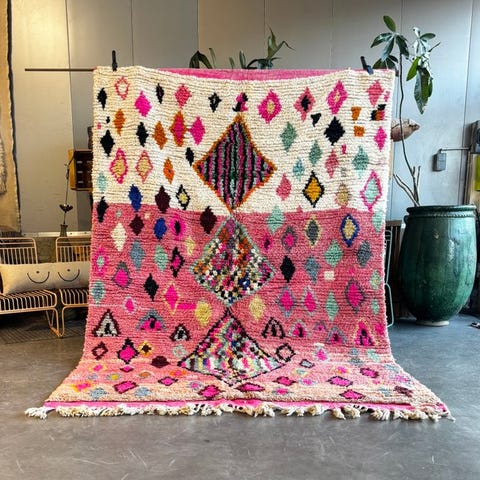 Lyserød marokkansk Berber vintage uldtæppe, oprindelse Atlasbjergene, Marokko, 310 × 190 cm, 100% uld, i meget god stand og professionelt renset, 21. århundrede. Klik på den blå "gå til varen" knap, for at købe eller byde på denne vare. Den samlede pris vil blive vist inden du afgiver dit bud.