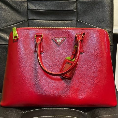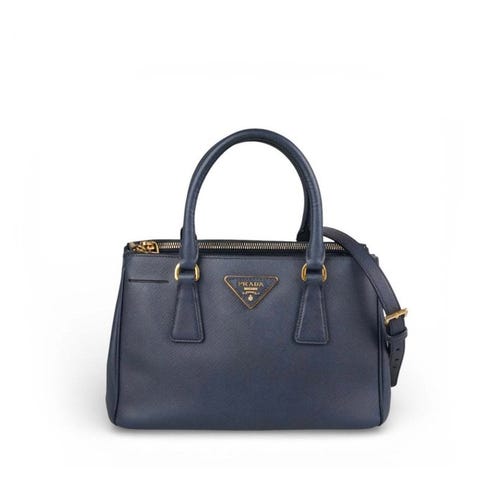 Sort, laklæder Galleria-taske i Saffiano Prada, med guldfinish, struktureret silhuet, der kan bæres i hånden eller på skulderen takket være den aftagelige rem. Indvendig lynlåslomme, stive håndtag, orange stofindretning med organiserede lommer og lædernøglering. Triangulært emaljeret logo foran. Sælges med dustbag.