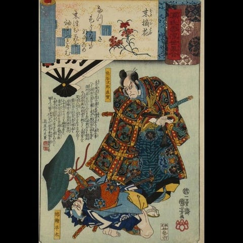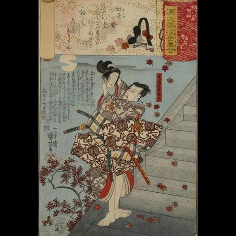 I denne design er kapitlet “Asagao (Morning Glory)” symbolsk parret med Fuwa Banzaemon, en formidabel samurajfigur kendt for sit viltre temperament og urokkelige beslutsomhed. I stedet for at skildre en bogstavelig Genji-episode skaber Kuniyoshi en stærk visuel analogi, der blander litterær reference med et dynamisk krigerbillede.