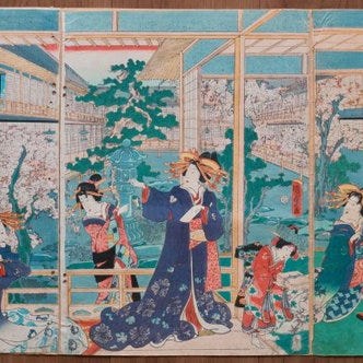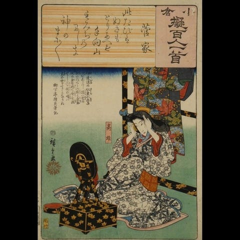 Utagawa Kuniyoshi Genji-gumo Ukiyo-e Awase tryk 'Asagao – Fuwa Banzaemon' fra Edo-perioden, et enkelt papirværk (353 × 239 mm) i rimelig stand, oprindelig Japan, privat samling, attribution Original. Klik på den blå "gå til varen" knap, for at købe eller byde på denne vare. Den samlede pris vil blive vist inden du afgiver dit bud.