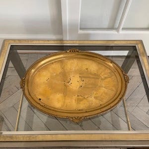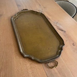 Dette antikke fad er fremstillet af massivt messing og udstyret med en elegant skulpteret kant og graciøse håndtag.