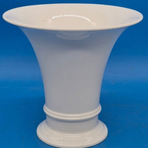 Vasen imponerer med sin klare linjeføring, den tragtformede åbne krop og den tidløse hvide glasur.