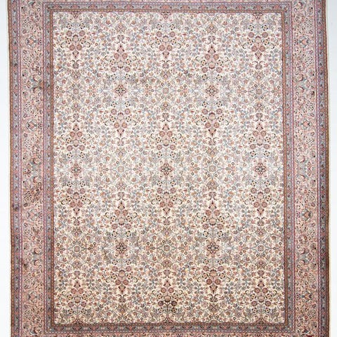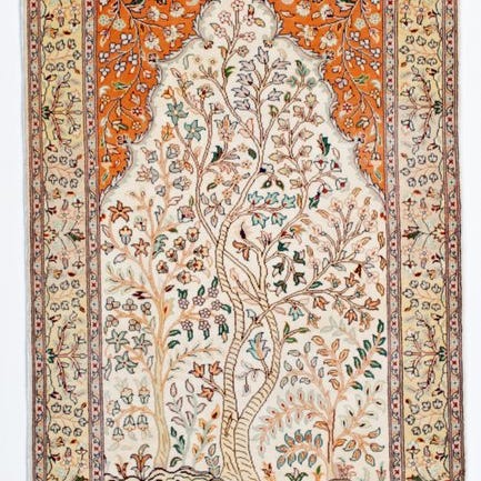 Denne tæppe er håndknyttet i Indien af Kashmir-silke. Ren silke er et af de mest kvalitetsrige og luksuriøse materialer til tæppeproduktion og giver værkerne et særligt elegant udseende. Persiske tæppekniplere flyttede tidligere til Indien for at udøve deres håndværk. Over tid har der derfor udviklet sig en omfattende tradition for tæppeproduktion i Indien. Mønstrene og farverne er inspireret af designet fra klassiske persiske tæpper. Mange
