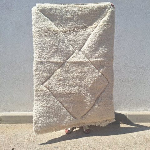 Materialer: Beni Ouarain-tæppet er lavet af ren uld fra får. Denne uld er blød, tyk og fyldig, hvilket giver tæppet en uovertruffen tekstur.