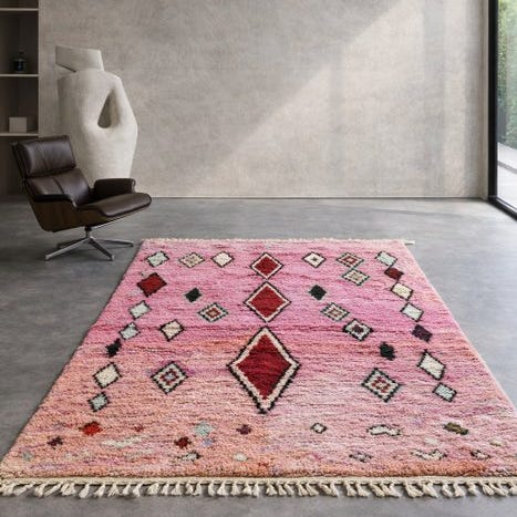 Denne autentiske marokkanske Boujad-tæppe er et moderne håndlavet uldteppe, vævet i Middle Atlas-regionen i Marokko af dygtige Berber-kunstnere. Boujad-tæpper er kendt for deres udtryksfulde frihed, symbolske sprog og dristige kromatiske kompositioner, hvilket gør hvert stykke til et unikt tekstilkunstværk snarere end en gentagende dekorativ genstand.