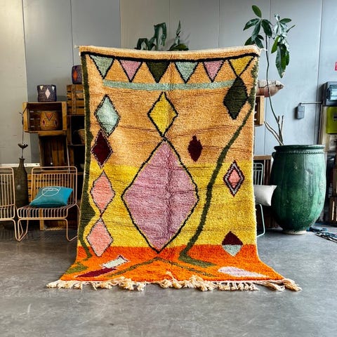 Måtten har en dristig og harmonisk geometrisk sammensætning, struktureret omkring diamantmotiver og flydende lineære elementer. Den livlige farvepalette kombinerer varm gul, orange, pink, olivengrøn, bordeaux og bløde pastelfarvetoner, hvilket skaber en stærk, men afbalanceret dekorativ tilstedeværelse. Designet er udtryksfuldt og moderne, hvilket perfekt forener Berber-tradition og moderne