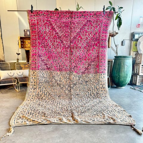 Dette marokkanske Boujad-tæppe stammer fra Boujad-regionen i det centrale Marokko. Det er helt håndvævet af 100% naturlig fåreskind, ved hjælp af traditionelle Berber-teknikker, mens dets visuelle sprog tydeligt er inspireret af Mid-Century Modern-design.