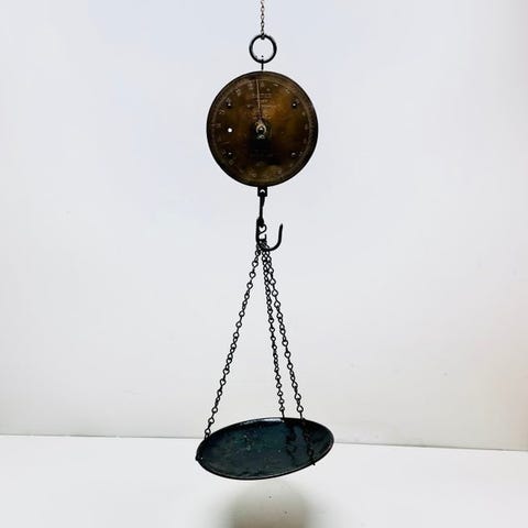 Ægte vintage mekanisk balancesvægt fra mærket Vishal, udført i grønmalet støbejern og udstyret med to originale messingvejeskåle. Denne type blev traditionelt anvendt i købmandsforretninger og på markeder, og den er i dag særligt populær som dekorativt og samlerobjekt.