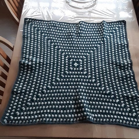 Plaid, b: 67 l: 79, Lille hæklet tæppe i hvid og lyse blå farver.