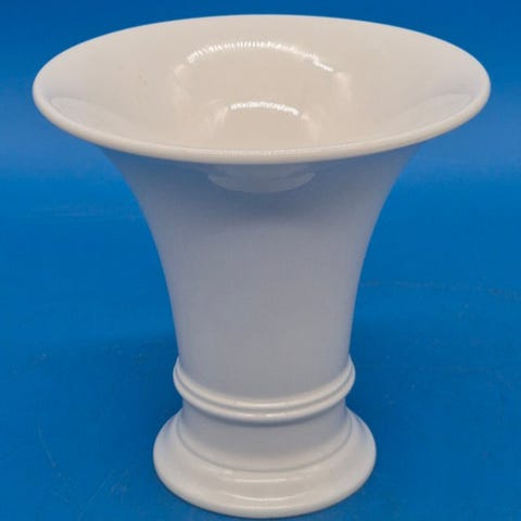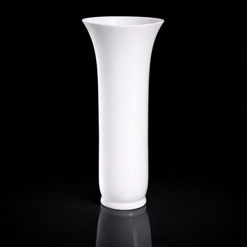 Vasen tiltrækker opmærksomhed med sin klare linjeføring, den tragtformede åbning af kroppen og den tidløse hvide glasur.