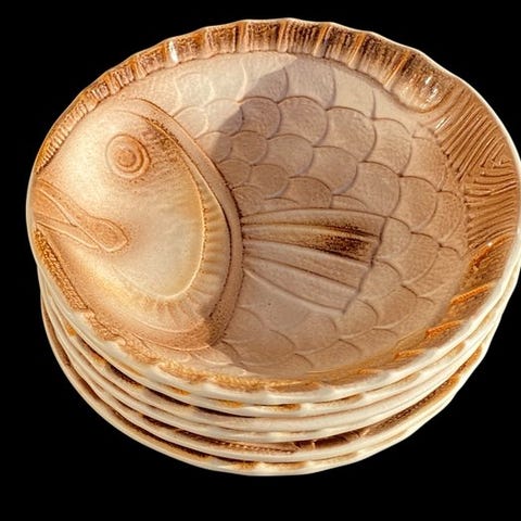 Vintage sæt med isglas, frugt, fløde, dessert, alkohol, smagning, amuse-bouche, champagne ... tallerken, tallerken, serveringsplade, skåle, underkop, rattan borddækning.