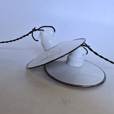 Retro staldæampe af emaljeret jern. Diam. 26 cm. Med ny guldfarvet stofledning, cirka 140 cm.