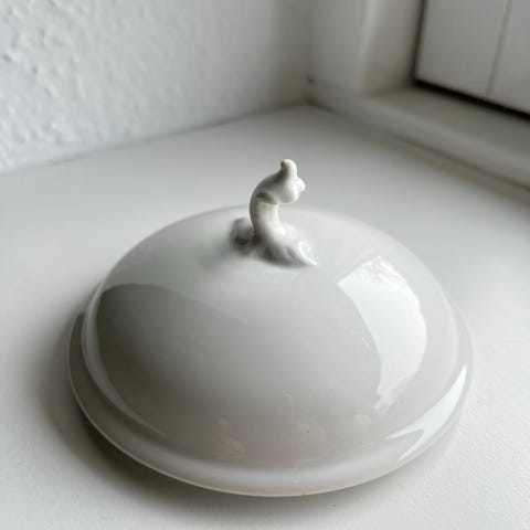 Royal Copenhagen låg til stel i porcelæn med traditionelt design. Låget har et håndtag og passer til tilhørende dele fra samme stel.