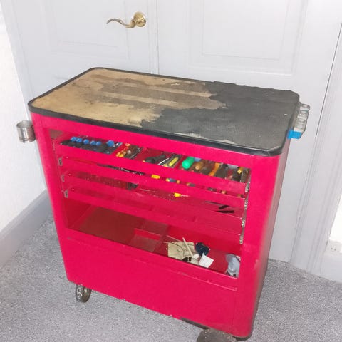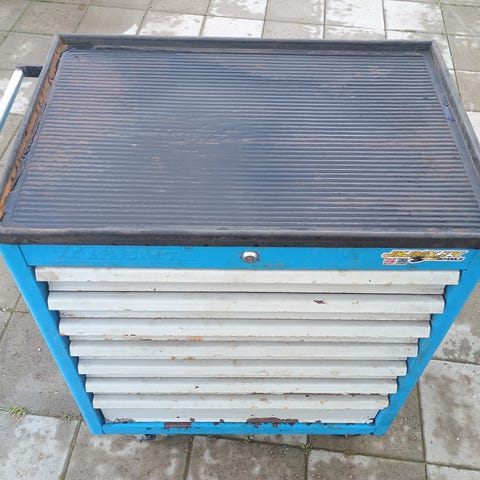 værktøjsvogn med flere opbevaringsrum. Værktøjsvognen er udstyret med hjul og håndtag for nem transport. Overfladen på topfladerne er beskyttet med gummimåtter. Fremstillet i metal med rød farve.