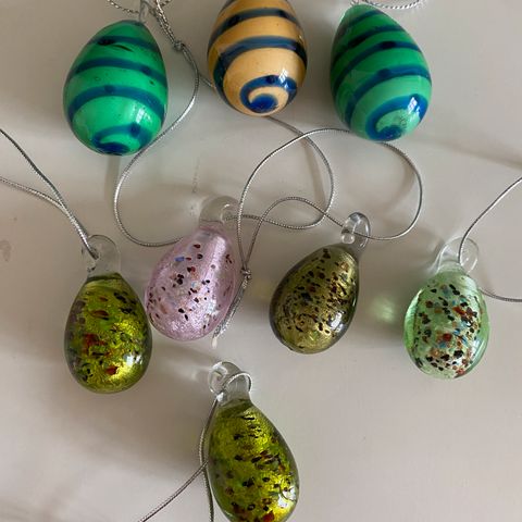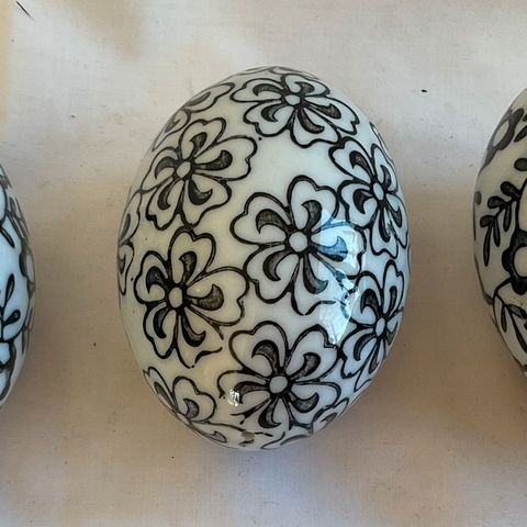 Dette er dekorative æg i keramik med krakeleret glasur, som bruges til påskepynt.
