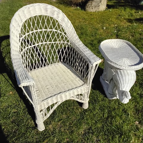 Smuk og karakterfuld vintage flet- og bambusstol, udført i klassisk buet konstruktion med et let og elegant udtryk. Stolen fremstår med en helt særlig autentisk patina, som giver masser af varme, sjæl og personlighed.