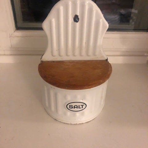 Denne genstand er en blå beholder med ordet 'SALT' trykt på forsiden. Den har et låg af træ og en vægholder, som gør det muligt at hænge den op. Beholderen er lavet af metal og har en rustik stil. Den er ideel til opbevaring af salt og kan let monteres på væggen i køkkenet.