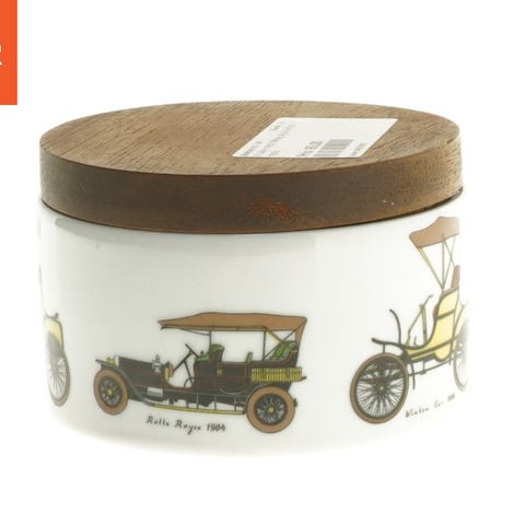 Denne krukke har et dekorativt design med billeder af vintage biler rundt om ydersiden. Den er lavet af hvidt porcelæn og har et rundt trælåg. Krukken har en diameter på 11 cm og er egnet til opbevaring af små genstande eller som dekoration.