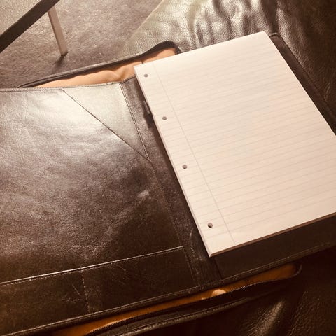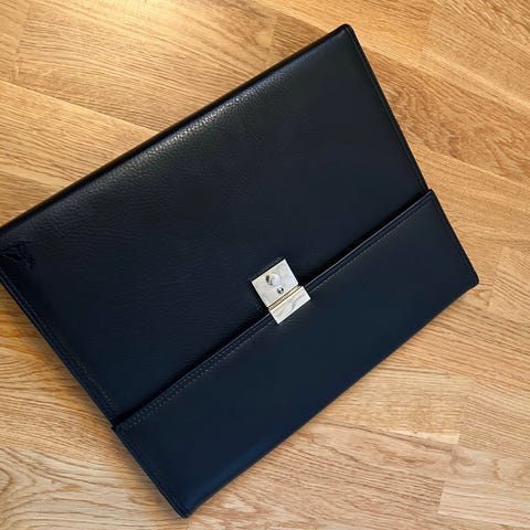 Denne dokumentmappe er lavet af brunt lædermateriale og har en firkantet form med dimensionerne 41x34x14 cm. Den har en solid håndtag på toppen og metalbeslag ved kanterne for ekstra stabilitet. Kortlåsning på toppen sikrer indholdet. Der er flere rum indeni til opbevaring.