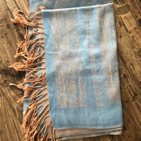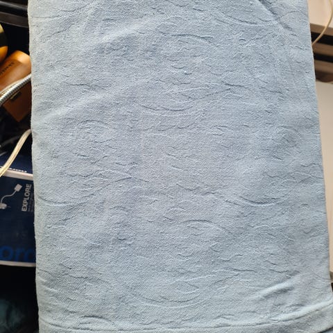 En sumk, blå dug med et diskret mønster i forskellige nuancer af blå. dugen har frynser i enderne.