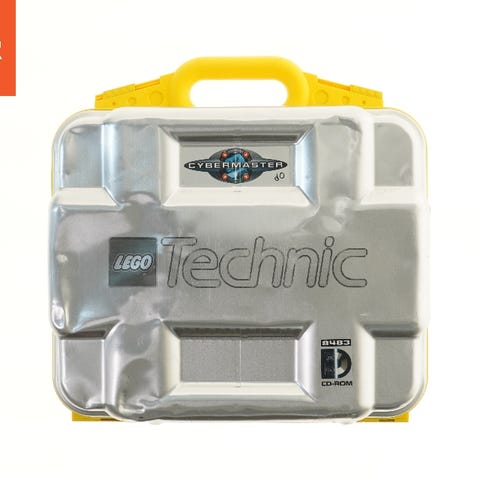 LEGO Technic Cybermaster sæt i en metal- og plastikopbevaringskasse med håndtag. Kassen indeholder forskellige LEGO Technic dele og tilbehør, samt manual og CD-ROM. Settet har dimensionerne 38x37x12 cm.