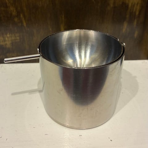 Denne objekt er et askebæger fra Stelton lavet i rustfrit stål. Det har en cylinderform med en diameter på 10,8 cm. Askebægeret består af to dele – en base og et kuppelformet låg som kan rotere.