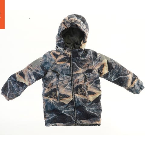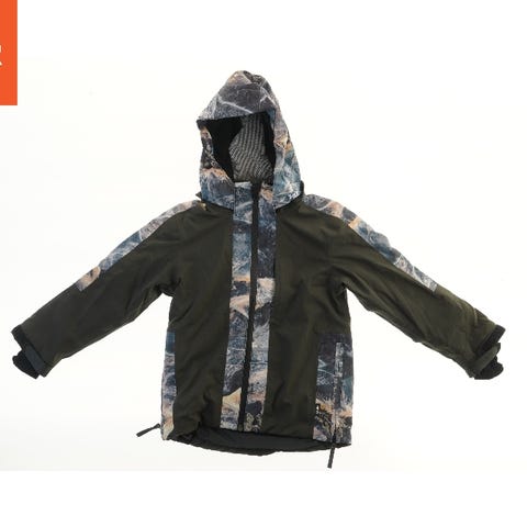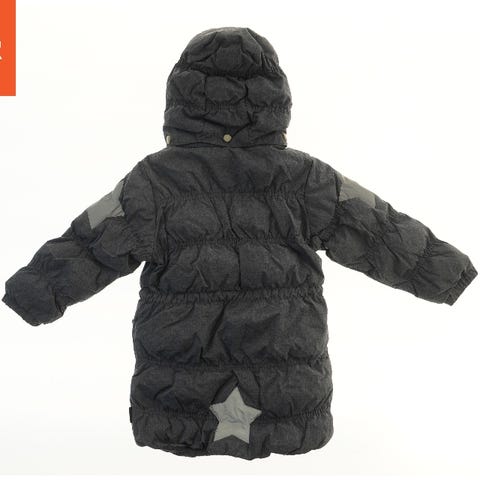 Denne grå vinterjakke har en hætte og fatninger med lynlåse. Den har refleksdetaljer på ærmerne og en stjerneformet refleksdetalje bagtil. Jakken er udstyret med elastisk syning, som giver en rynket effekt.