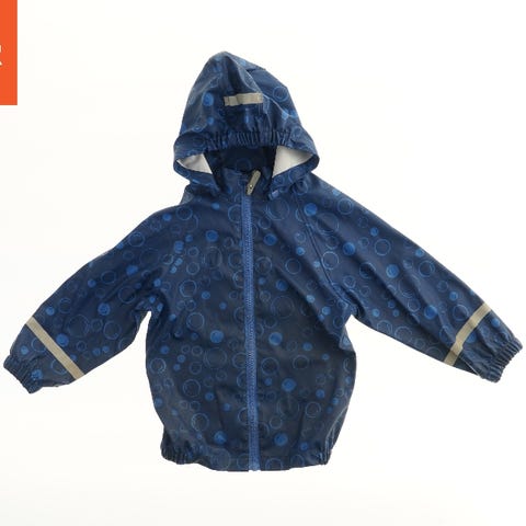 Regnjakke med hætte og lynlås. Jakken har vandrette striber i blå og grønne nuancer med hvidt mønster. Der er to lynlåslommer på forsiden og elastik ved ærmeenderne.