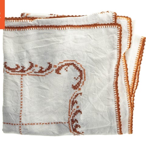 Hvid stofdug. Dugen er dekoreret med detaljeret håndbroderet fladsyning i en gylden tråd. Der er ingen synlige mærker, og dugen ser generelt ren og velholdt ud.