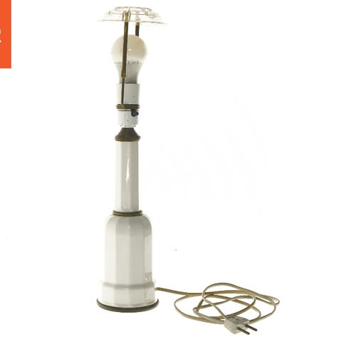 Heiberglampe, bordlampe af hvid porcelæn med messingdetaljee., samlet højde er 48 cm. Intakt fatning med afbryderknap/tænd/slukfunktion og integreret skærmstativ i messing. Skærmstativet kan afmonteres hvis man ønsker at anvende skærm monteret direkte på pæren. Almindelig E27 fatning. Designet er klassisk, eksklusivt og funktionelt. Flot på et skrivebord, sengebord, sidebord, skænk eller vindueskarm. Passer både i er klassisk og moderne hjem, da den er meget stilren.