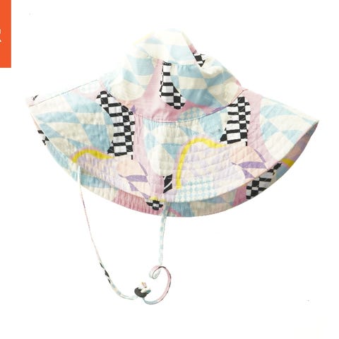 En hvid solhat med bølgende kant og bindebånd. Hatten er lavet af let stof, hvilket gør den egnet til sommerbrug.
