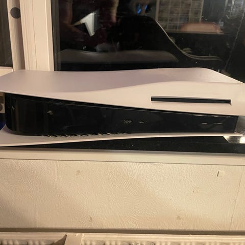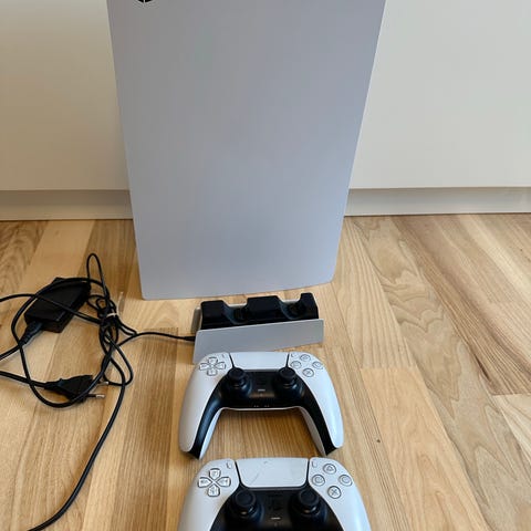 Sony PlayStation 5 spilkonsol med to trådløse controllere. Konsollen har HDMI-udgang og flere USB-porte til tilslutning af eksternt udstyr. Designet med en kombination af sort og hvid farve.