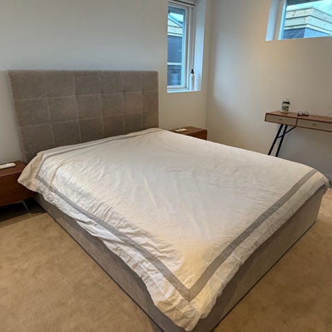 Seng med sort polstret hovedgærde og ben i metal. Det ene ben sidder løst, hvorfor prisen. Benet skal sættes ordentligt fast, men formodentlig ok let. Sengen står på træklodser, som løfter sengen 9 cm. På denne måde er der plads til opbevaring under sengen.