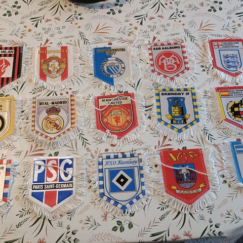 DBU Danmark fodbold vimpel med portrætter af spillerne, men den er fra 1983. Ligget i en kasse i flere årtier, og bagsiden er ikke så pæn mere.