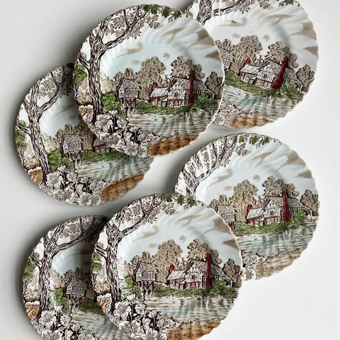 Country Style kagetallerken sæt i blå og hvidt porcelæn. Sættet indeholder flere tallerkener med dekorative mønstre, der forestiller landskab og blomster. Tallerkenerne er håndmalet og fremstillet af porcelæn.