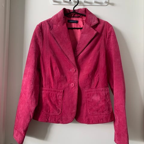 Super flot og elegant ruskindskjole prydet med læderdetaljer ved halsudskæringen, skuldrene, lommerne og forneden fra Isaksen Design i str. 44, er lille i størrelsen