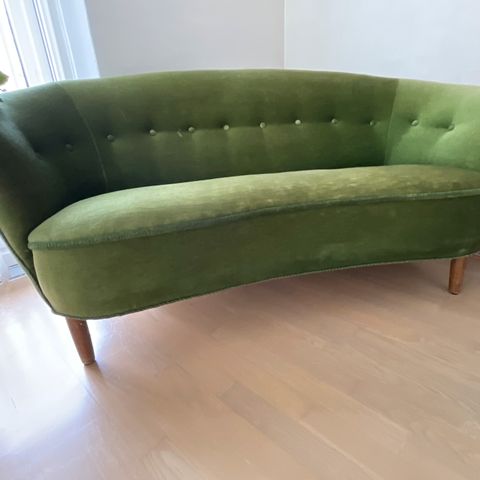 Grøn velour banansofa med de fineste frynser. Rigtig flot stand. Den er nok fra 70erne og dansk design. Man sidder virkelig godt i den. Jeg synes ikke fotos yder retfærdighed for den flotte dybe grønne farve velouren har.