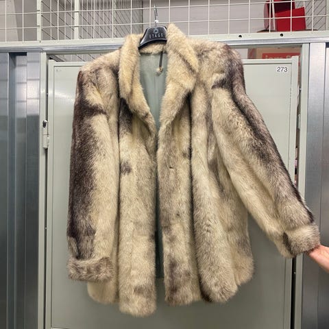 Den er i super flot stand og har været opbevaret tørt og ved stabil temperatur. Den har lidt slid på undersiden af højre ærmekant. Ellers i meget flot stand. Alle hægter intakte, lommer og indvendigt bindebånd.