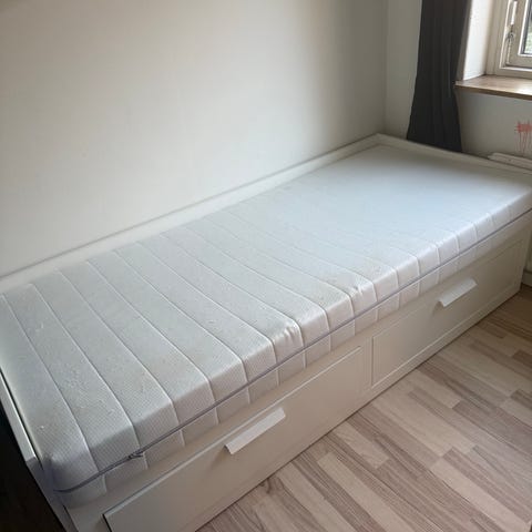 IKEA seng med opbevaringsskuffer under sengen. Sengen er hvid og har en enkel, funktionel opbygning. Passer til standard madrasstørrelse. Egnet til opbevaring af tøj eller andre genstande under sengen.