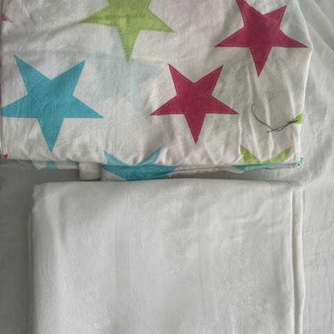 To stribet dynebetræk i 220x140 ekstra længde. Økologisk GOTS certificeret bomuld. Lidt revnet øverst på det ene betræk. Tyk, god kvalitet. Nypris 1400,-
