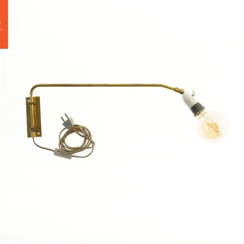 To væglamper lavet af messing, hver med en simpel, slank cylinderformet design. Lamperne er udstyret med hvide ledninger og stik til hjørnemontering. Den blanke messingfinish giver et moderne og stilrent look. Lamperne er designet til at give direkte lys og er ideelle til små belysningsområder.