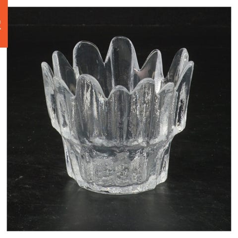 Denne glasslysestage har en størrelse på 11x14 cm og er designet til at holde et enkelt lys. Den har en rund base og en cylindrisk midtersektion. Overfladen viser nogle tegn på brug med voksrester og pletter.