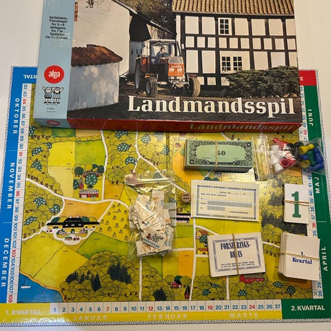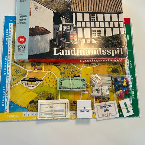 Alga Landmandsspil brætspil. Spillet indeholder elementer relateret til landbrug og bondegårdsaktiviteter. Egnet til familier og børn til underholdning og læring om landmandsliv.