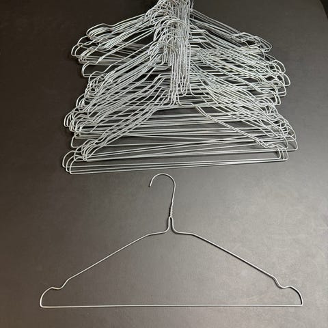 Sølvfarvet renseri bøjler med en fletning foroven. De er købt ved Lise Jensen Bøjler.