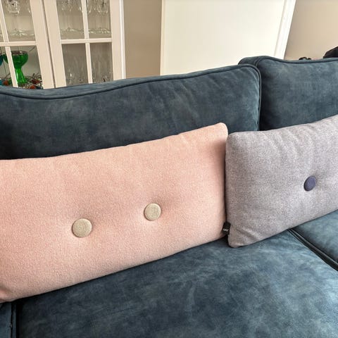 Hay pude med knapper i grå og gammelrosa farver. Puderne har en rektangulær form og to synlige knapper på forsiden i kontrastfarver. Materialet fremstår som tekstil.